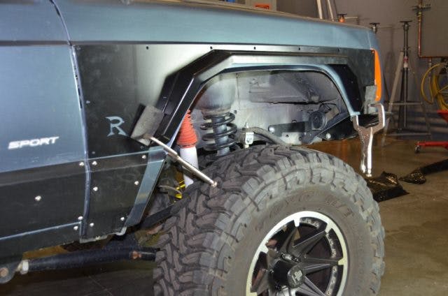 Steel fender flares for a Cherokee is revolutionary. The sheet metal of the Jeep can now be opened up an additional 3.5 inches over the stock fender and flare, and is far stronger than stock. Built from 1/8-inch and 3/16-inch steel, Rusty’s notes the new flares can be used as Hi-Lift jack points if necessary.