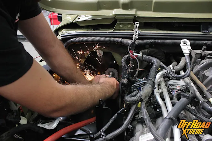Following that, the entire stock battery tray was unbolted from a total of nine 10mm bolts, stretching from the fender well to the firewall. Per the instructions, we cut the factory air box mount neatly from the battery tray, as it would be the only stock piece we would need to put back in the Jeep.