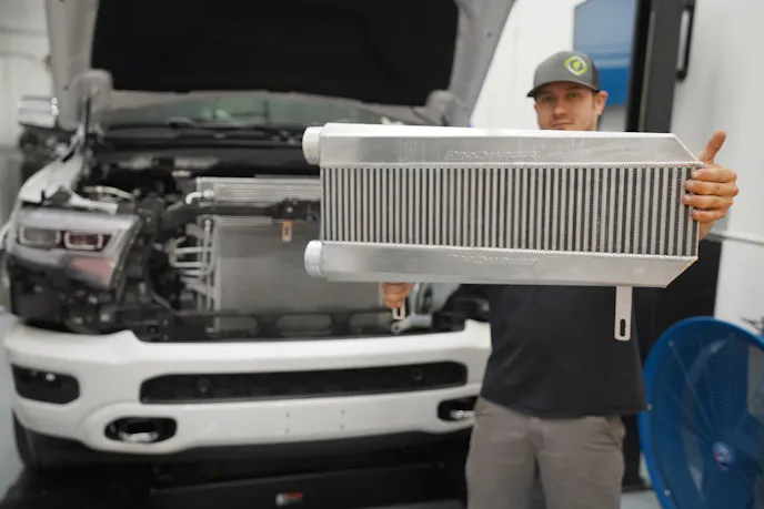 That intercooler is another key aspect of this kit. Supercharged air heats up as it’s “shoved” into the intake. The intercooler – in this kit, an air-to-air version – allows more power since the air will be denser when it’s cooler. The air-to-air option is simple and effective. The system design cools the air charge down without any complexity of water systems, pumps, wiring, or relays. Like many OEMs that use forced induction, the simple method works best for long duration use such as this Ram along with most vehicles.