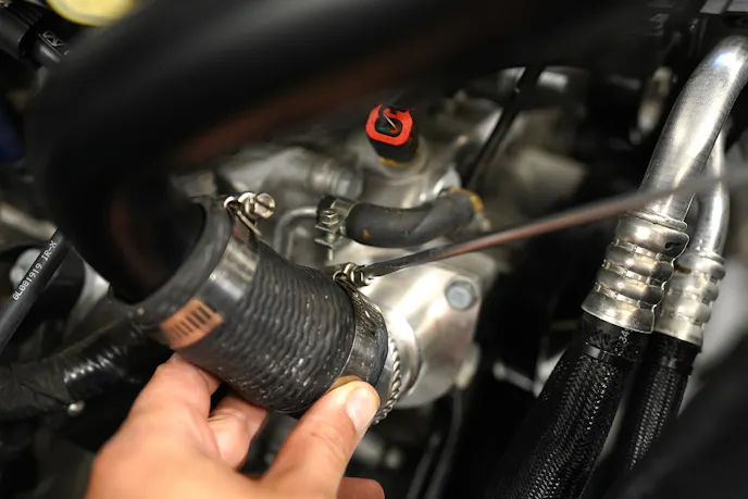 You will also install a new, supplied 45-degree thermostat housing and a rubber radiator hose reducer. The upper radiator hose needs to be trimmed down to 22-inches from the radiator outlet with the rest discarded. Between the reducer and trimmed hose will be a coolant transfer tube with a 5/8-inch, 45-degree barb for the hose-end that was attached to the thermostat housing. This is all done to make room for the intercooler piping and charge tubing into the intake.