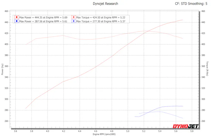 Before and after the ProCharger system installation was completed, the truck was run on a chassis dyno. Below, we can see the side by side before and after dyno chart comparison. The vehicle baseline peak horsepower was charted at just under 290-horsepower and nearly 280 ft-lbs. of torque in stock form. This is indicated in blue. After the ProCharger supercharger, the truck was measuring over 444-horse power and 424-torque numbers at similar RPM.