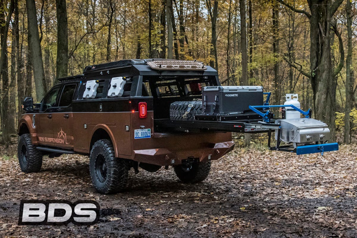 This behemoth of a vehicle originally debuted at the 2019 SEMA show. Starting with a 2020 F350 and adding a BDS-suspension 4” radius arm kit, the truck was given some bumper and fender treatments to clear 40” tires. With a utility bed housing more tools than your mechanic uses in a week, a rooftop tent, a portable kitchen and an Addictive Desert Designs bumper housing a Warn winch, Project Go Beyond is built to handle anything – except compact parking spaces. Click here to learn more!
