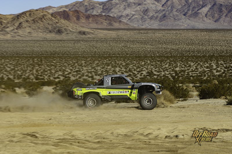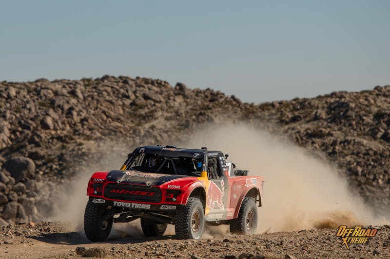 Unlike the Prologue lap the main race was a side-by-side start with one-minute gaps. This shorter start gap was evident by time the trucks hit the first remote pit about 14-miles out, with the trucks already starting to bunch up and passes being made. With the trucks now clearing the pits, third-place qualifier Justin Lofton was not in the pack with a transmission issue siding his race. Lap 1 would also dash Bryce Menzies chance at a three-peat leaving him stranded out in the desert with a broken upper link and driveshaft, unable to complete the first full lap.