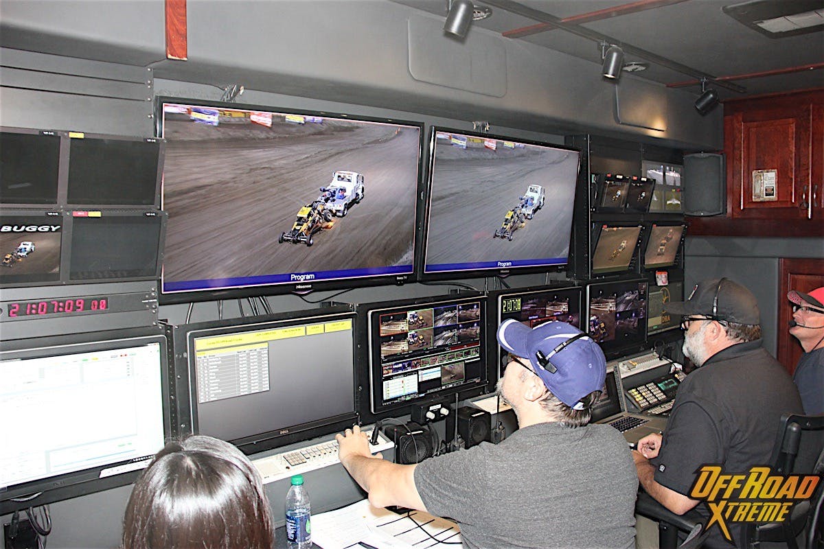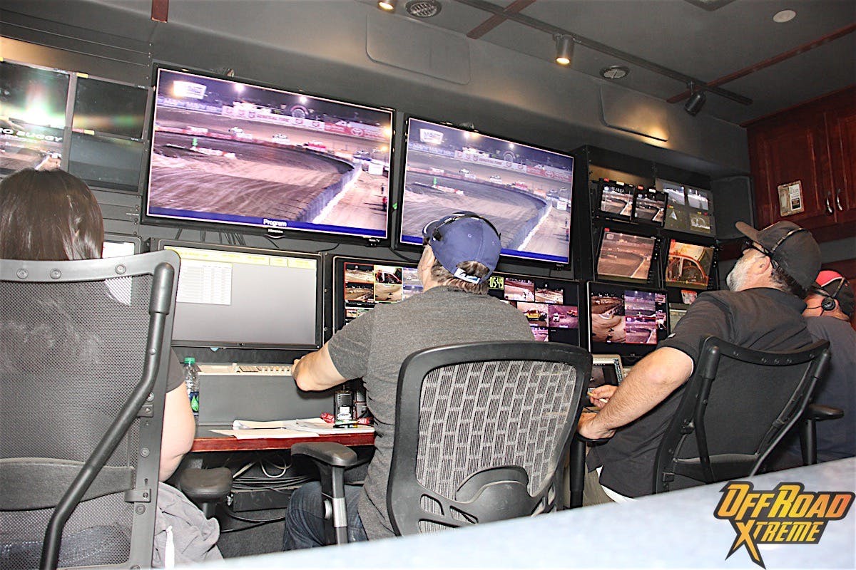 One aspect of night racing that was intriguing to see what Lucas’ video team, Lucas Oil Production Studios. Here, a team of seven people was fixated on several TV and computer screens as feeds from eight cameras positioned around the track offered real-time glimpses into the action on the dirt.