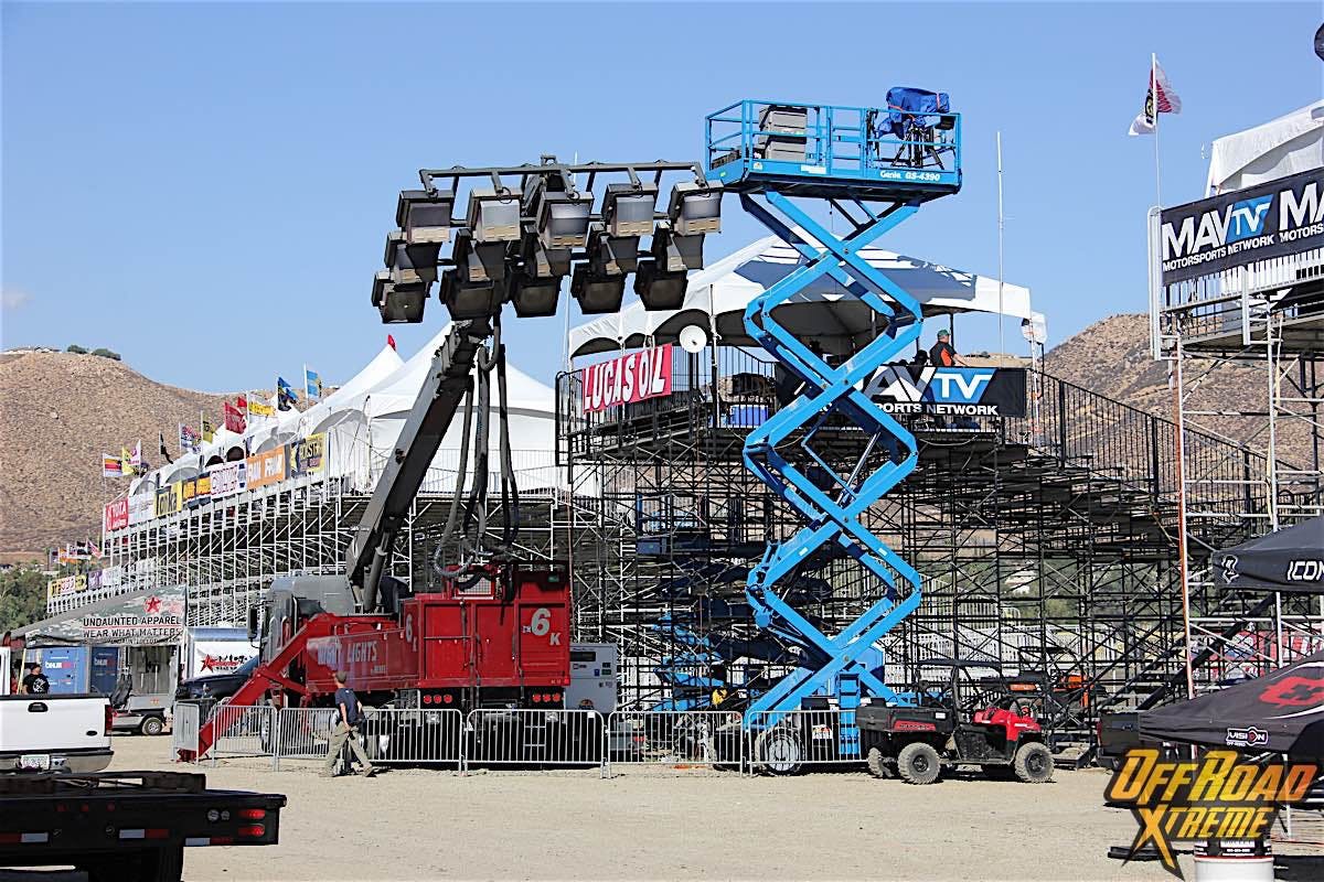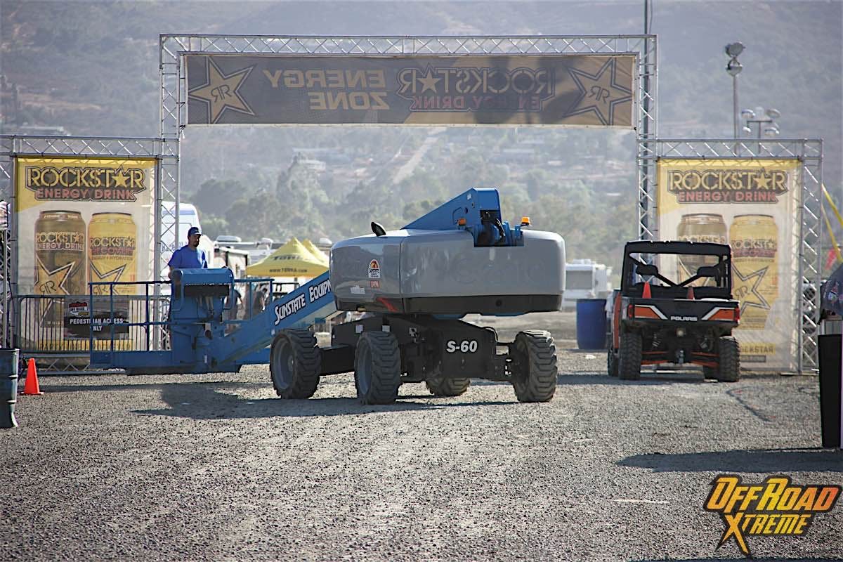 The tech tent (left) manages having race trucks roll through to be inspected before heading to the staging lane. Cherry pickers (right) help workers set up banners, inflatable displays, and light fixtures.