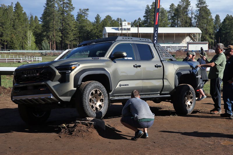 Four-wheel disc brakes, electronic rear locking differential, front stabilizer bar disconnects, and Old Man Emu (OME) heavy-duty shocks. These forged monotube position-sensitive 2.5-inch dampers feature rear external piggyback remote reservoirs as the standout feature. Protecting all of that is an assortment of steel skid plates that protect the front end, transmission, and rear differential. Frame-mounted rock rails and a high-clearance exhaust tip show that Toyota engineers really understand the needs of off-roaders and overlanders. The rear even has a high-lift jack point integrated into the frame end. This is a serious truck, not a poser, and something worthy of the Toyota badge.