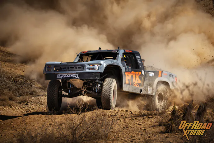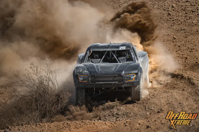 As it turns out, due to a communication error, Cayden was unaware of how close the race was. In order to preserve his truck, the smart strategy was to slow the pace down. After the #1 truck went in for a planned stop at the remote pit, halfway through the lap, the bad news dropped. It was now obvious that the Grabowski truck was not only making up time but had taken the lead on time. “From there we went hammer down mode,” Cayden said after the race. But as other trucks had learned, the desert would only allow so fast a pace, and about ten miles from the finish, he caught a flat tire.