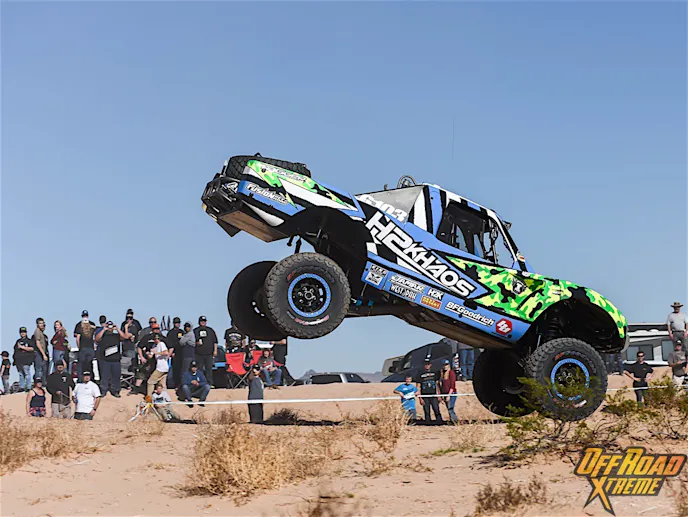 Thursday’s Time Trials determined the race order for Saturday’s main event. Almost immediately social media and local conversation was dominated by Sam Baldi’s spectacular end-over-end crash on the bunny jump on the qualifier course. Fortunately, nobody injured in the crash and Baldi’s crew had the car ready to race by Saturday’s start time, earning points for their trouble. The 2012 Parker 425 Champion, Robby Gordon, took the lead spot overall at Thursday’s qualifiers in his Speed Energy, Toyo Tires racing custom Trick Truck, only to break his transmission flexplate in the first lap of the main event on Saturday.