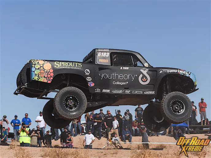 Thursday’s Time Trials determined the race order for Saturday’s main event. Almost immediately social media and local conversation was dominated by Sam Baldi’s spectacular end-over-end crash on the bunny jump on the qualifier course. Fortunately, nobody injured in the crash and Baldi’s crew had the car ready to race by Saturday’s start time, earning points for their trouble. The 2012 Parker 425 Champion, Robby Gordon, took the lead spot overall at Thursday’s qualifiers in his Speed Energy, Toyo Tires racing custom Trick Truck, only to break his transmission flexplate in the first lap of the main event on Saturday.