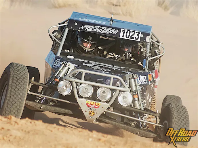 As race day wore on, the desert course at Parker claimed its share of victims. Top qualifier and early leader Robby Gordon lost his transmission on the first lap, opening an opportunity for Rob MacCacheren who held lead for about half the race before he also broke with a blown engine on the second.