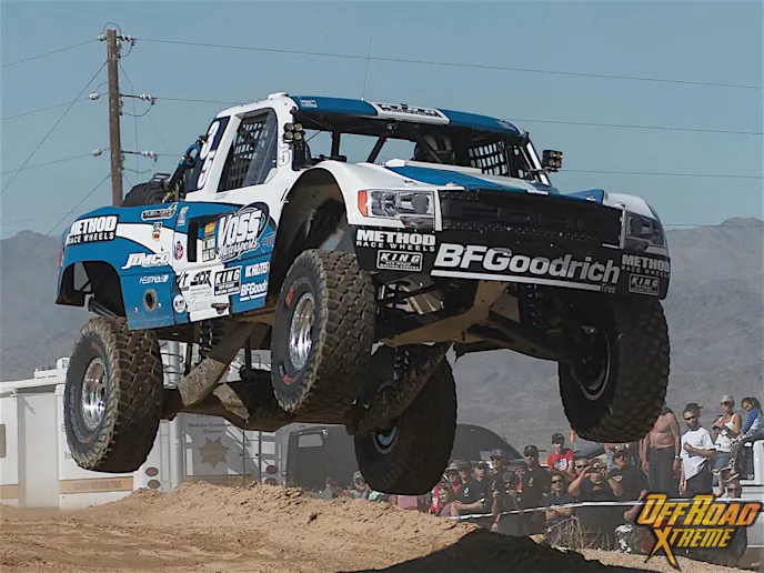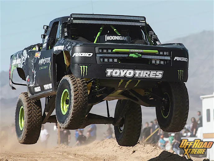 Thursday’s Time Trials determined the race order for Saturday’s main event. Almost immediately social media and local conversation was dominated by Sam Baldi’s spectacular end-over-end crash on the bunny jump on the qualifier course. Fortunately, nobody injured in the crash and Baldi’s crew had the car ready to race by Saturday’s start time, earning points for their trouble. The 2012 Parker 425 Champion, Robby Gordon, took the lead spot overall at Thursday’s qualifiers in his Speed Energy, Toyo Tires racing custom Trick Truck, only to break his transmission flexplate in the first lap of the main event on Saturday.