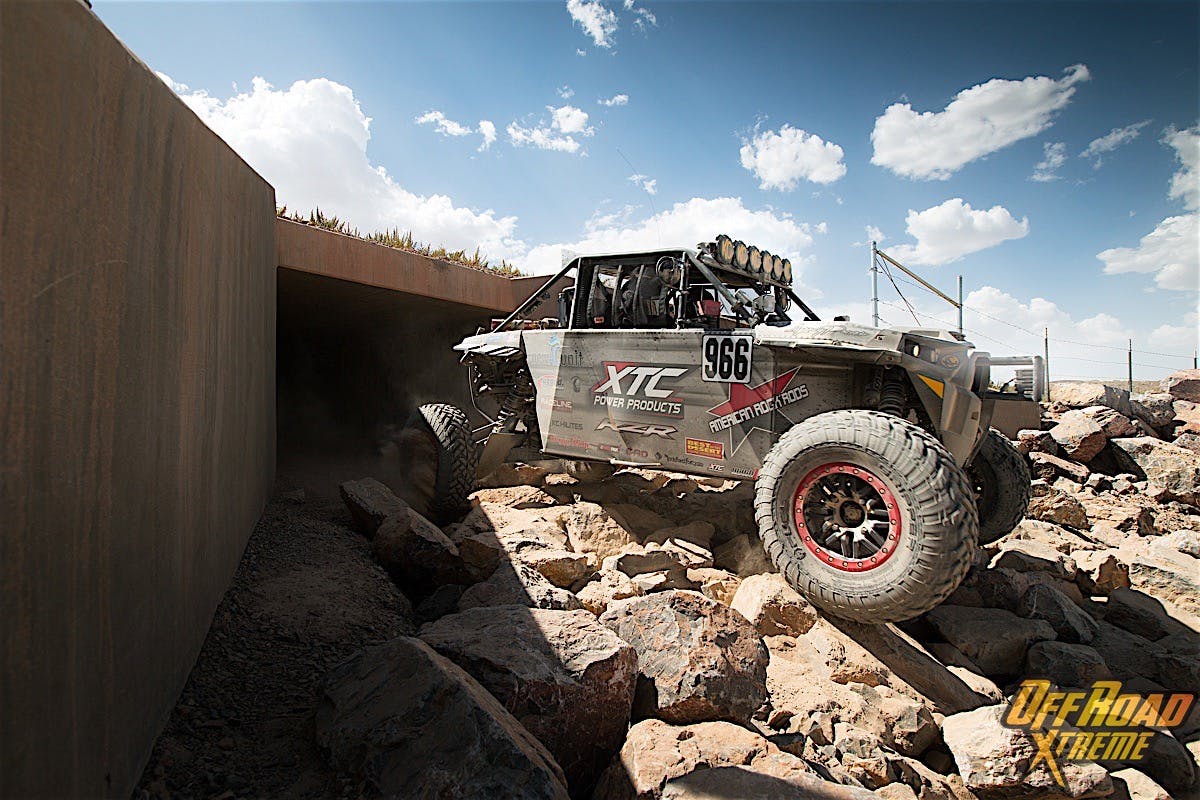 Phil Blurton and Wayne Matlock would be battling it out for the lead in the Turbo UTV class over the next 50 miles. This years course had a freeway underpass with a seven foot height clearance and a bed of rocks to follow. Larry Rossler driving the Safecraft Polaris RZR was of the drivers that managed the rocks with ease seeming to float over them while most the Can-Am’s would have some difficulty.