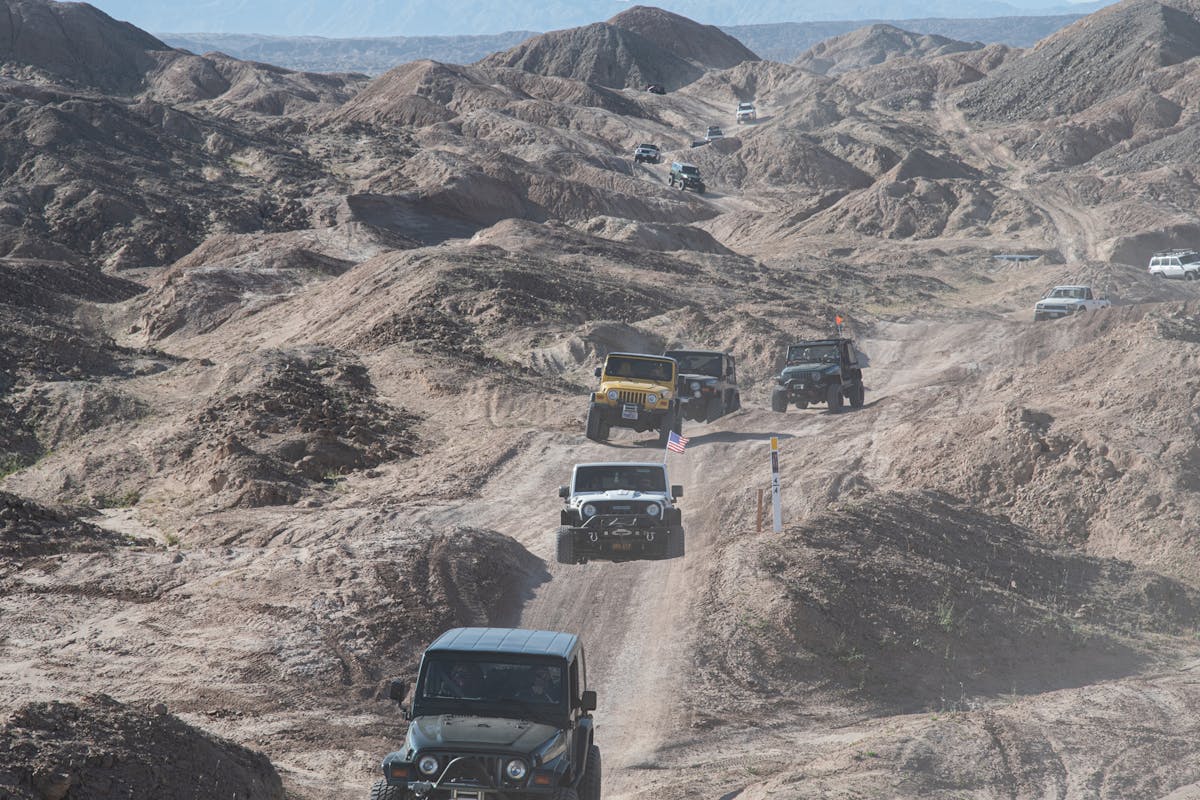 After all of the markers are set, it’s time to meet up with my driver for the day, Green Route trail boss Jon Gray. His rig for the day is the “War Wagon.” The War Wagon is a purpose-built, no-frills Power Wagon which proudly displays its battle scars from years of roaming the desert. As we near the start time, attendees start lining up and before too long, a string of over 100 vehicles are airing down and making last minute preparations. The range of rigs was impressive with fully built heavy duty crawlers, side by sides, a fleet of jeeps spanning decades of production and mix of stock trucks and SUVs all eager to enjoy the 14 miles of trail ahead.