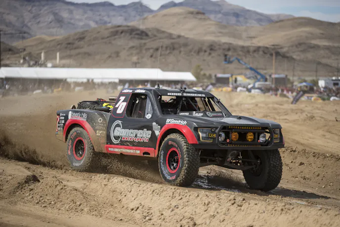 The day started with the Concrete Motorsports truck on the pole and Harley Letner dominating until the head gasket let go just after the start of the third lap. This gave the lead to Ryan Arceiro in the Levi’s truck until a flat tire in the FOX Shox “Proving Grounds” took him out of the running. That flat then allowed McMillin and Bryce Menzies, the driver of the four-wheel-drive Red Bull truck and 2018 Mint 400 winner, to pass by as he was changing the tire on course during the final lap.