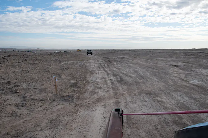 At 8 o’clock sharp, the wheels start rolling on the Dodge. We are off with what seems like an endless string of vehicles in tow. Winding through a few of the outlying camps, the caravan follows the laid-out markers and turns towards the open desert. The first few miles contain a mix of hard-packed sand and ruts. As we wind towards less level ground, the line starts to spread out to reduce dust. Soon, the terrain takes on a noticeable change and as the hills and valleys become closer together, the line of vehicles closes the gaps, snaking through the first real glimpse of what this land really has to offer.