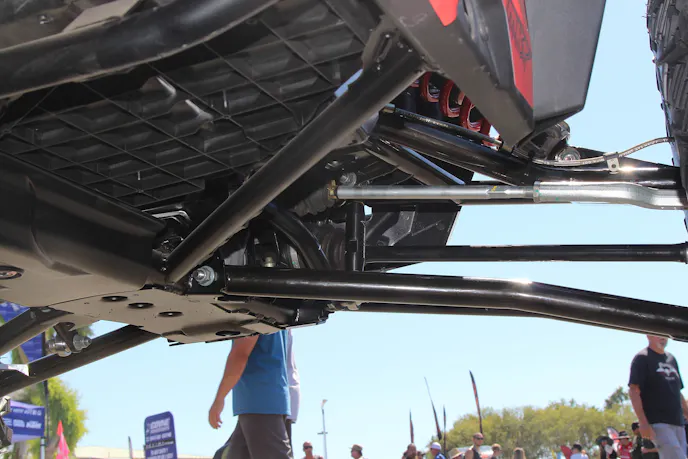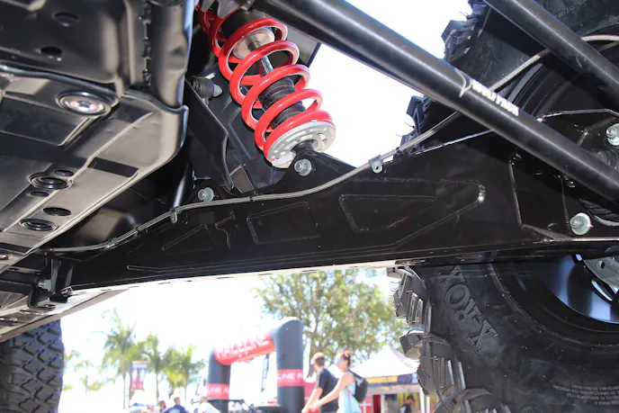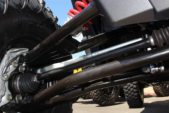On the RZR’s front, the upper and lower control arms were 1.25-inch-diameter, .120-inch wall thick. “These arms are pretty much indestructible,” Alex commented. “We plan on making a boxed kit and ‘Plus-3’ boxed kit for the Turbo models as well. On the rear, we have boxed trailing arms that are made of chromoly and are clam-shelled together with internal gusseting. We TIG-weld the components ourselves, so we have quality control there.” What’s more, Alex pointed out the radius rods have adjustable heim joints inboard and outboard to adjust toe-in and toe-out.