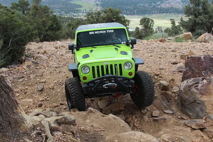 As we got to the trail, Don hopped out and deflated the tires. Our Wrangler was equipped to deal with the legendary terrain, spec’d out with Currie axles, air lockers, and hopefully, these spiffy Nexen Roadian MTXs. A light drizzle came down and thunder was heard from far off. The excitement built as we made our way further along the trail.