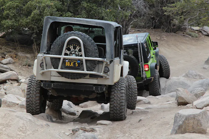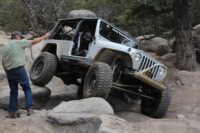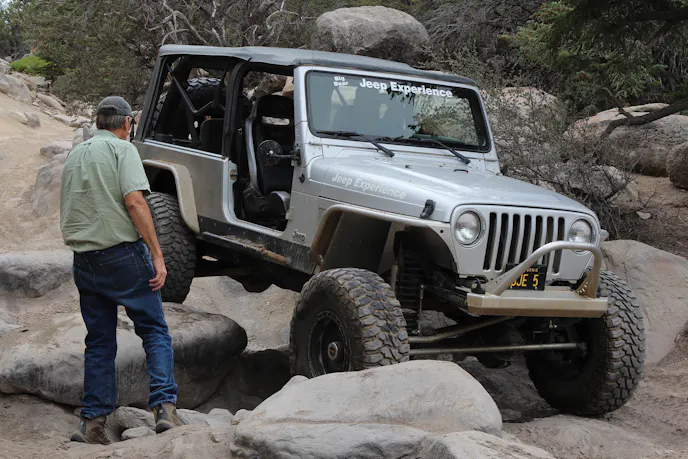 On the silver TJ, the driver was a bit new to off-roading, so Don parked his JK and guided the driver through. Even when teetering to a near tip-over, Don proved that a driver could get out of anything if he trusted the spotter and obeyed his instructions. It was amazing to watch the TJ make the same journey the JK did. The Jeep ambled over enormous rocks, using momentum, steering, and precise timing to make its way up.