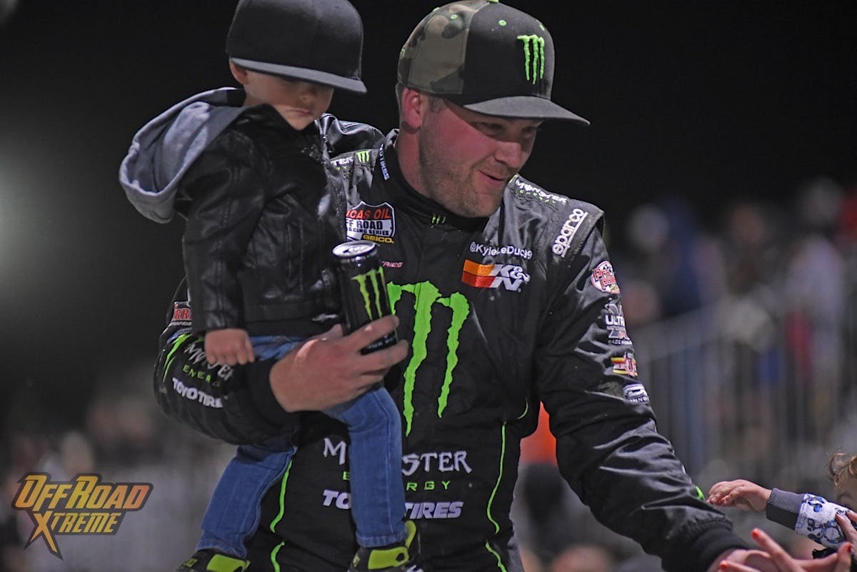 Kyle LeDuc (with his son) shook hands with spectators as he climbed up on the podium after his Pro 4 win.