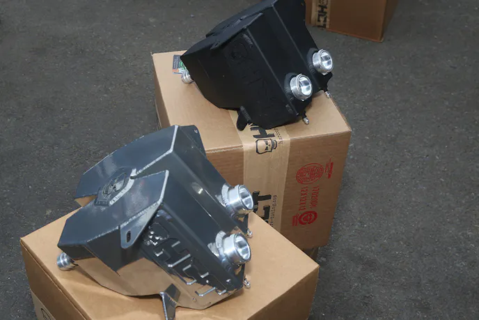 Hard Core Tuning has a split cooling tank system that sends 100 percent of your coolant through the radiator. The coolant from your engine and the heat exchanger are now running independently which lowers the intake charge air by about 100-degree delta across the tanks.