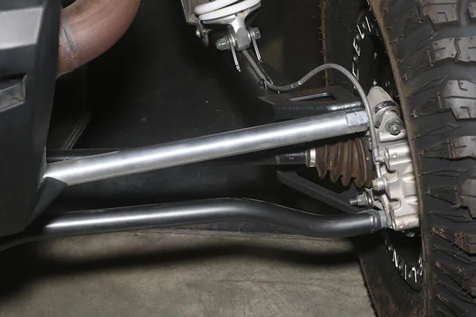 Their lower radius rods are 1.25-inch diameter quarter inch thick wall chromoly tubing with double bends to increase ground clearance. They represent a 600 percent increase in strength over the factory parts. The upper radius rods are 7075 aluminum.