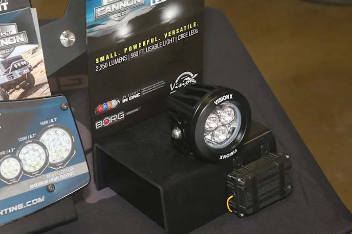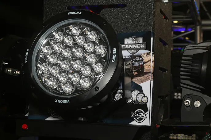 We stopped in to talk with Evan Keck from Vision-X lighting and found out the details on some of their newest innovations in lighting. “Our new light cannon is using flat chip technology,” said Evan, “We use a 10-watt chip that we are under driving to seven watts. We are getting over 110 lumens per watt.”