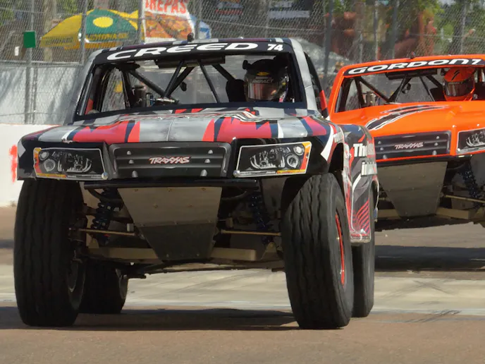 Viso looked to have the race under control at this point, but overdrove the tight left hand turn 10. Creed saw his opportunity and went inside Viso to take the front spot back. Keegan Kincaid and Robby Gordon, running third and fourth at the time, also took advantage of Viso’s mistake and relegated him to fourth place. Creed drove to his second win of the year with fellow TRAXXAS teammate Kinkaid second, and series founder Gordon third.