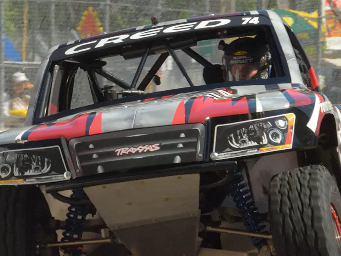 The two drivers battled side by side for much of the race, swapping the lead back and forth. As the field passed the starters stand on the last lap, Viso had a slight lead over Creed. At the first ramp, Creed had moved alongside of Viso and the two drivers took the jump side by side. Creed passed Viso in the air, nearly lost control of his truck as it landed hard on the front wheels, and darted hard left. Viso battled back and regained the lead at the next corner.
