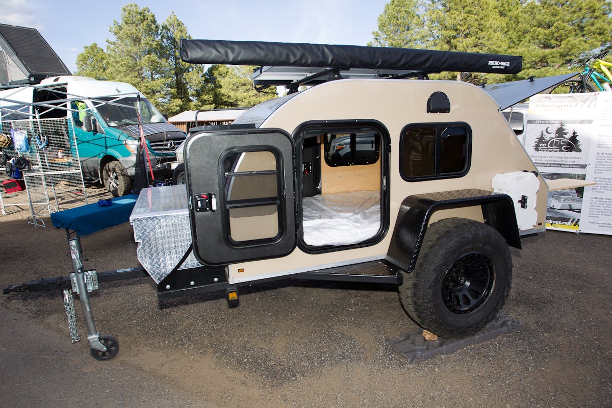 The other option is a production trailer. These can be customized how you would like your trailer to be, or be ordered off the shelf, so to speak. Most of the patrons I spoke to like the medium-size teardrop or low-profile trailers. They’re not too high or wide, are easy to tow, and have all the comforts of home in a small vessel. Your sleeping area is enclosed and protected from the elements.