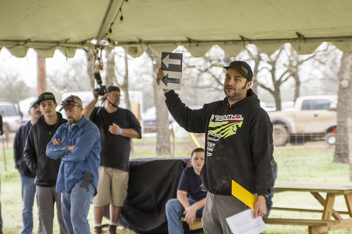 TRR owner and event organizer, Trey Palreiro (left), leads a driver meeting prior to opening the track for practice runs. Driver meetings address course layout as well as any track or safety concerns participants need to be aware of.