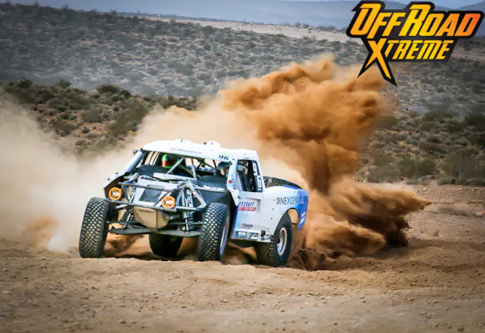 Brothers Kevin and Scott Shields take their 3-seater Truggy across the desert in the 2017 Mint400 boasting their new sponsorships with 1NiceRide, Method, and Fox.