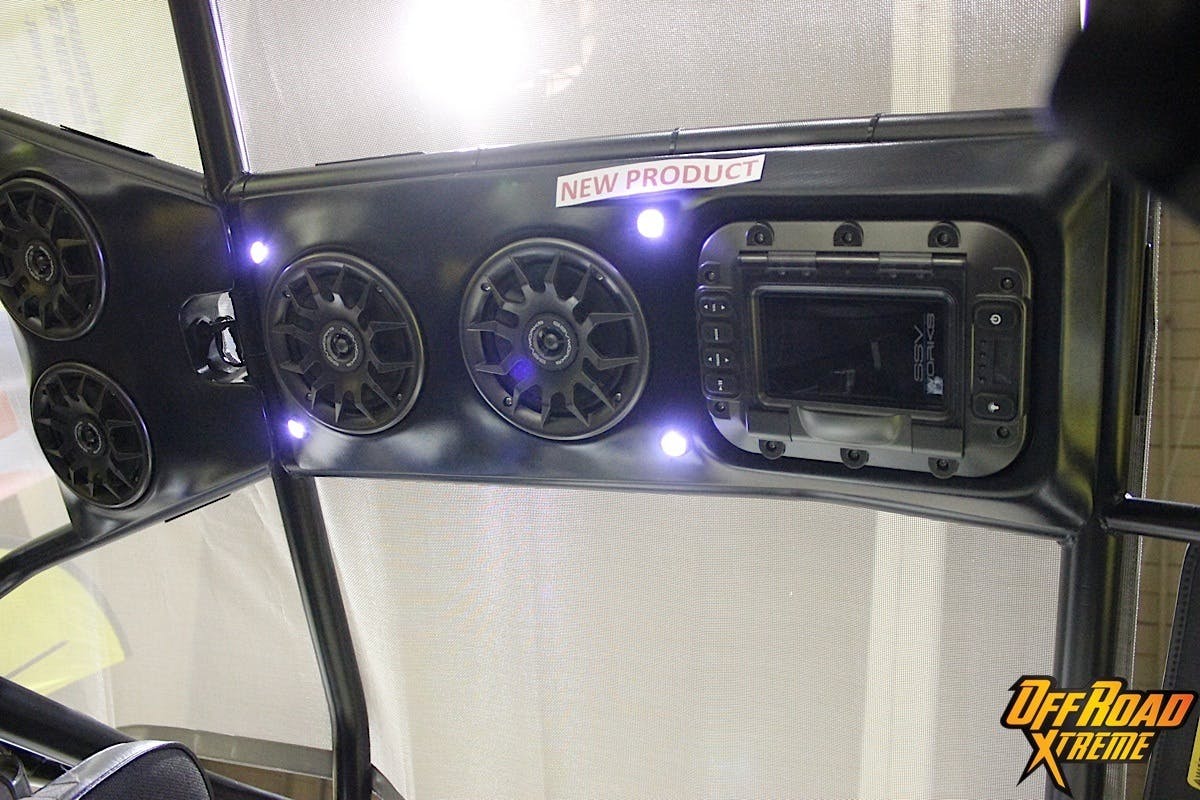 Finally, we got the full scoop on GenRight Off Road as we swung by on Sunday. The company’s popular JK full roll cage kit now has a cool little electronic partner, the Rock Garden Four Speaker Audio System. This roof-mounted device bolts up to the cage and keeps your MP3 player (iPhone, Android, tablet, etc.) locked away inside a waterproof and dust-proof case, while also keeping it charged and ready for phone calls.