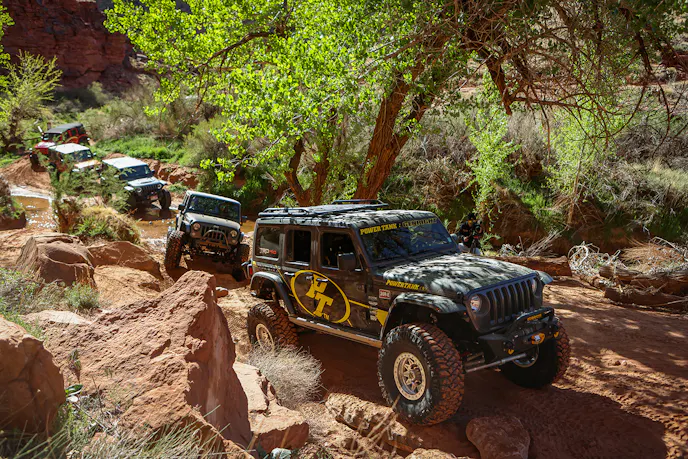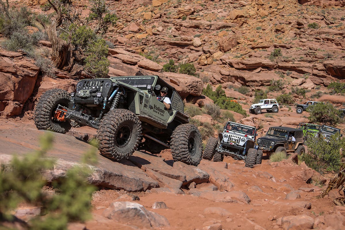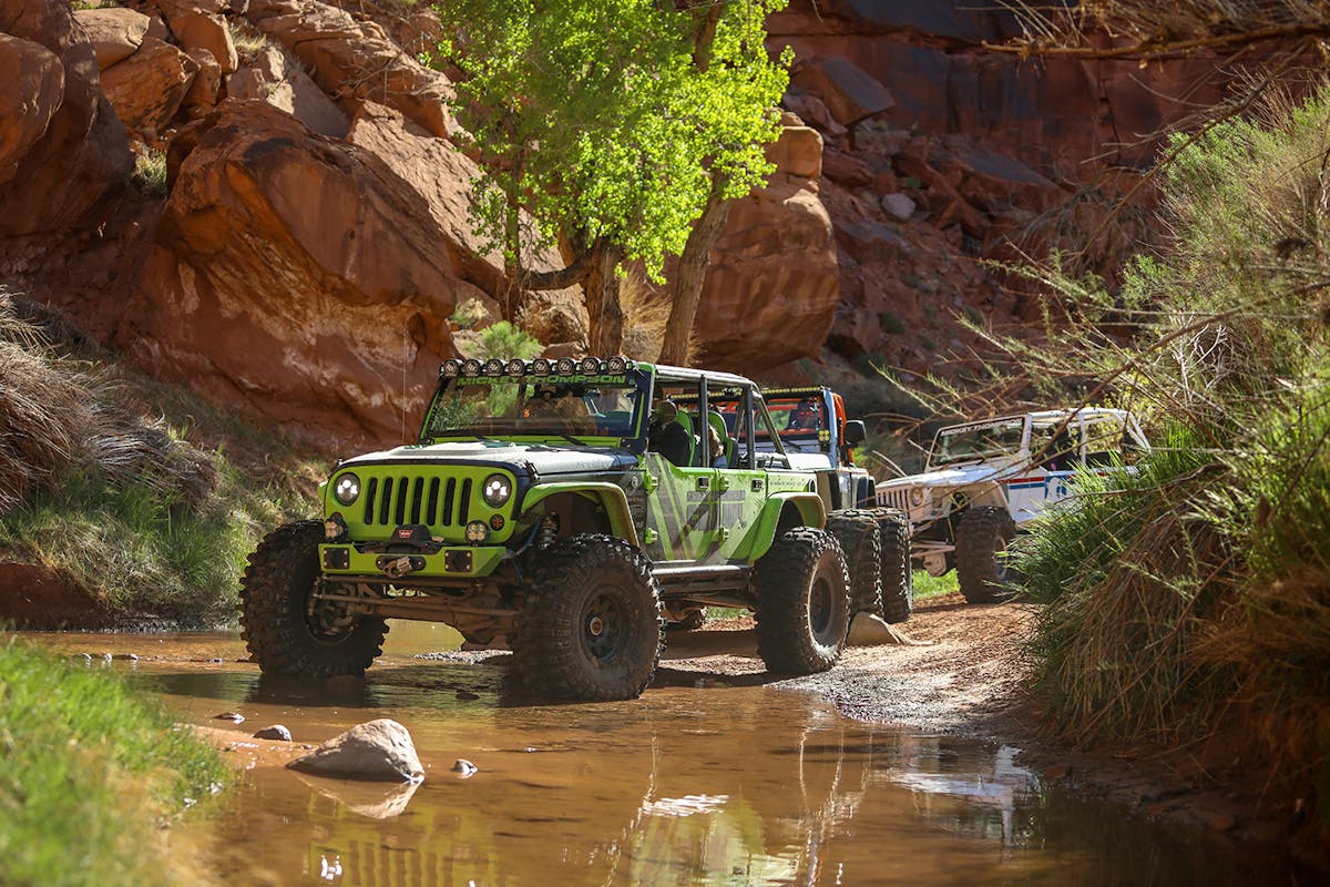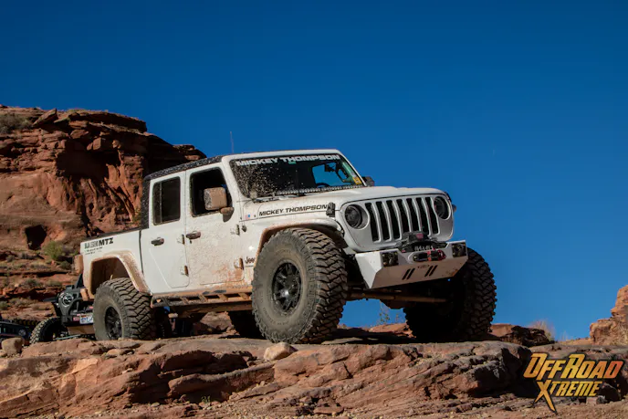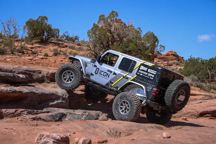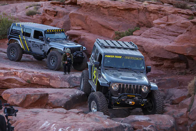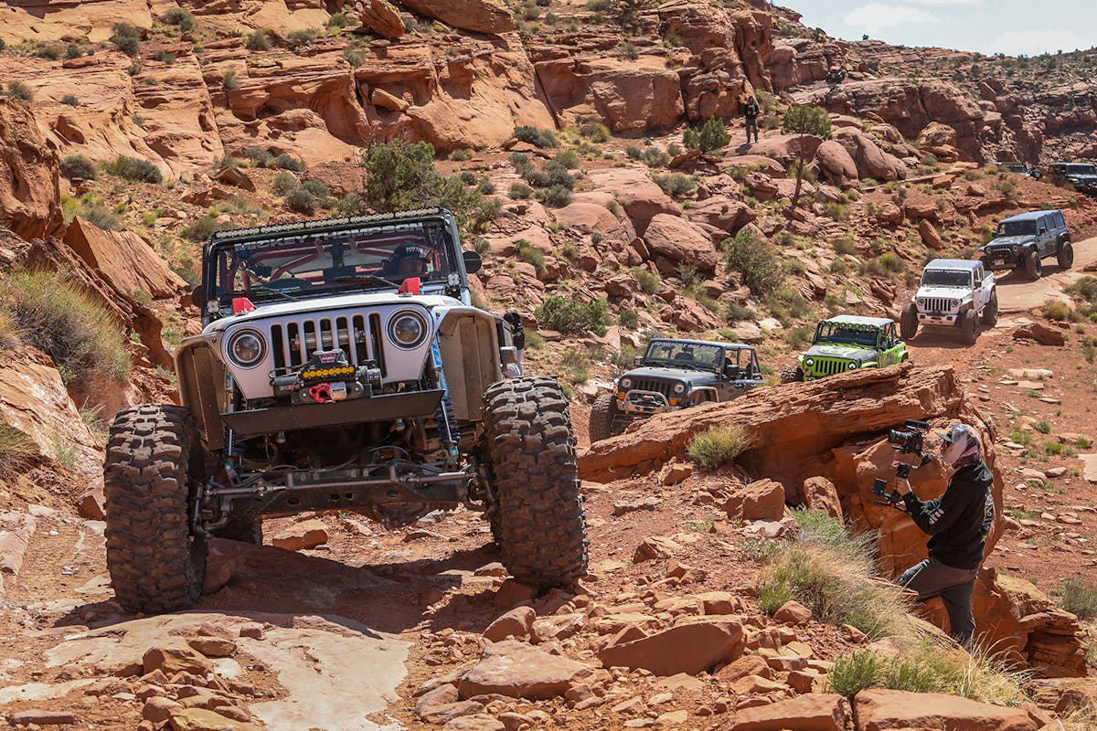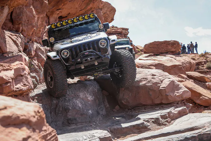 To handle the obstacles on Cliff Hanger, our Jeep is equipped with Fabtech Motorsports Long Arm Crawler System, 37-inch Mickey Thompson Baja Boss A/T Tires, 17-inch Dirty Life Engima Wheels, Body Armor 4×4 Bumpers and Spare Tire Carrier, Rock Slide Engineering Step Sliders, Warn VR EVO 10-s Winch, Factor 55 Hawse Fairlead and UltraHook, 4122 Hitch Slider, and Bolt Lock Accessories. You can read about the build in Part 1 and Part 2, and hear about our complete adventure of how we made it out to Easter Jeep Safari and back.