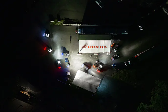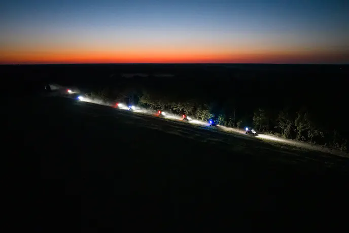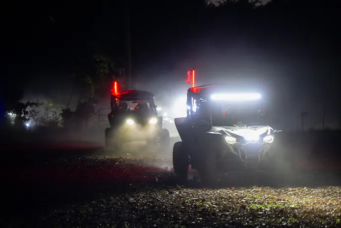 We were led down and out to another trail called The 88, which featured several creeks and river beds with steep surrounding hillsides. The forest foliage was thick and obscured in darkness, but the Hondas were cutting through the night with the bright lights.