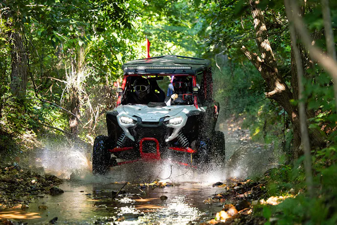 Now super satisfied, we strapped in, fired up the performance-tuned 999cc four-valve Unicam parallel-twin engine, flipped on the accessory LED lighting, synched up the Garmin Tread navigation system, and fell in line with our fellow UTV enthusiasts.