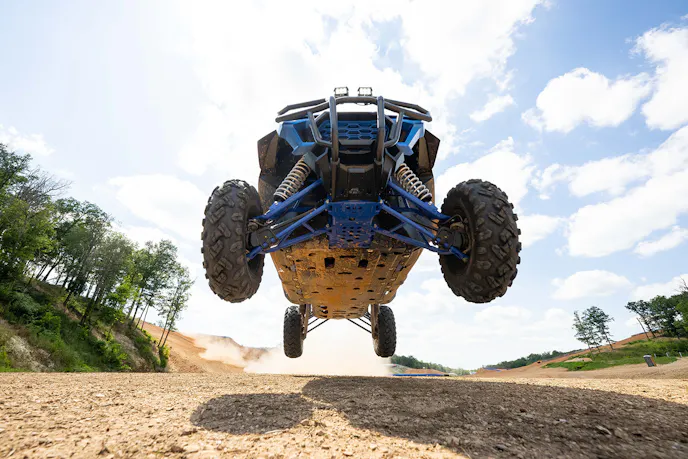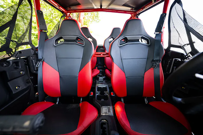 Besides being able to comfortably fit four full-size dudes, my favorite features were the good useable power, and Launch Control. Perhaps the unsung hero of the Talon 1000R-4 is the Fox Live Valve system. I would advocate that this car could use a taller set of tires to get more ground clearance. We did bottom out in the rocky creek beds several times, but the Talon is loaded up with skid plates from front to back.