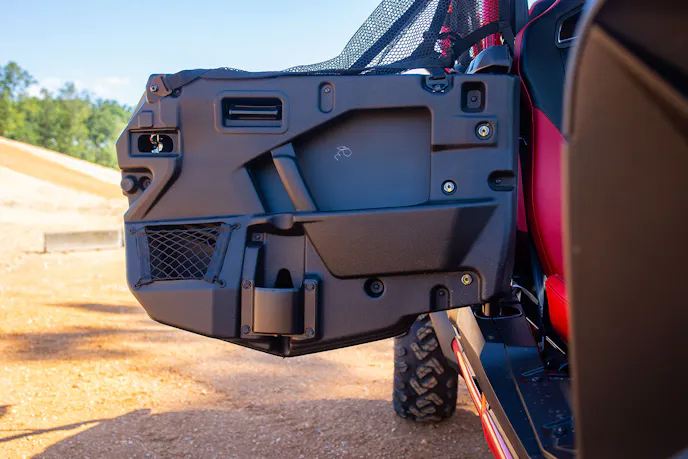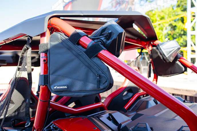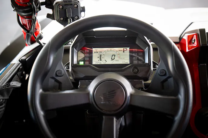 I really liked the Honda red version and thought it was the most popping of the only two options, so I found an open unit and stashed my gear. Scoping out the vehicle up close and in person revealed a precision-constructed vehicle with premium fit and finish. I thought the painted plastics looked great and were a nice upgrade to some other competitor units.