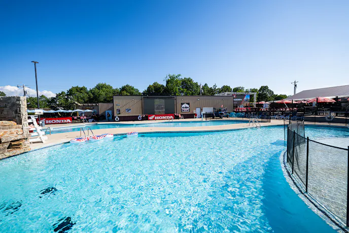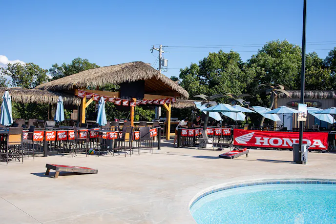 Moving on, I observed the impressive pool area which would rival any resort on either side of the Mississippi River. Multiple pools, a thundering waterfall, and a lengthy lazy river that winds around a sizeable splash pad are the main features. There are multiple cabanas and a mass of shaded seating that skirts the edges of the pool area. The outdoor bar keeps everyone hydrated and cool with the thatch roof.