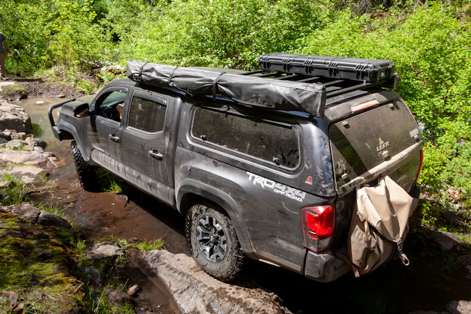 I would have been in the truck for this, but someone had to take the pictures. Spotter in place, Zeb crawled over the first set of boulders successfully and then laid his drivers front on a large slab of rock with an abrupt inside edge. On the opposite side was another large rock, so both front tires were tenuously gripped to wet rock. Zeb lowered the front of the Tacoma into the large puddle and started steering right to get into the narrow space between the third set rocks. The left rear tire slid off the abrupt edge and the departure angle of the bed slammed down on the tall slab and dented the underside of the bed.