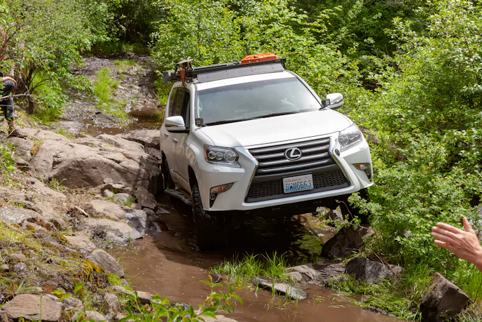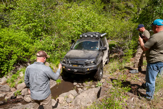 Once through the narrow puddle it was a climb straight up the side of another few boulders then over smaller puddles until the road elevated above the creek. Mike Block came through next, wiser for seeing what Zeb did. He sailed through in his Lexus, then returned to teach the rookies about spotting.