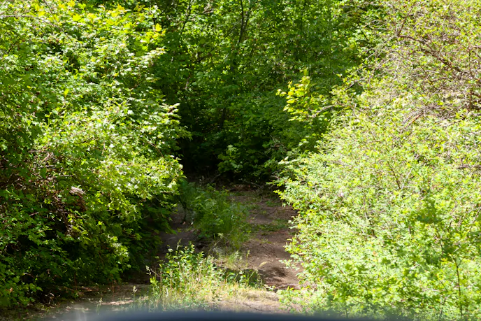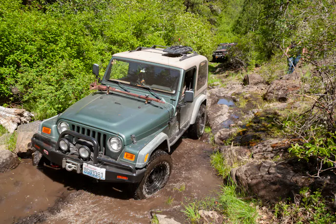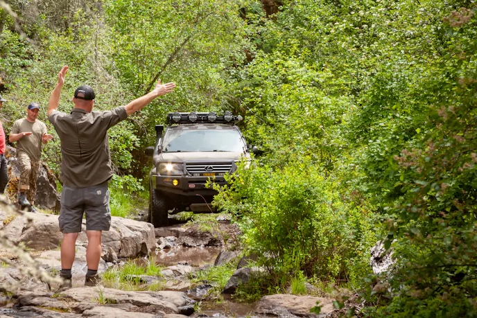 The trail meandered up a canyon and along the creek before it got narrow. The native plants started to get dangerously close to whipping through open side windows. The road started showing more protruding rock preceding a water-crossing. Word went out on the radio that we would gather at the creeks edge so the rookies could get a quick tutorial on safe water crossing.