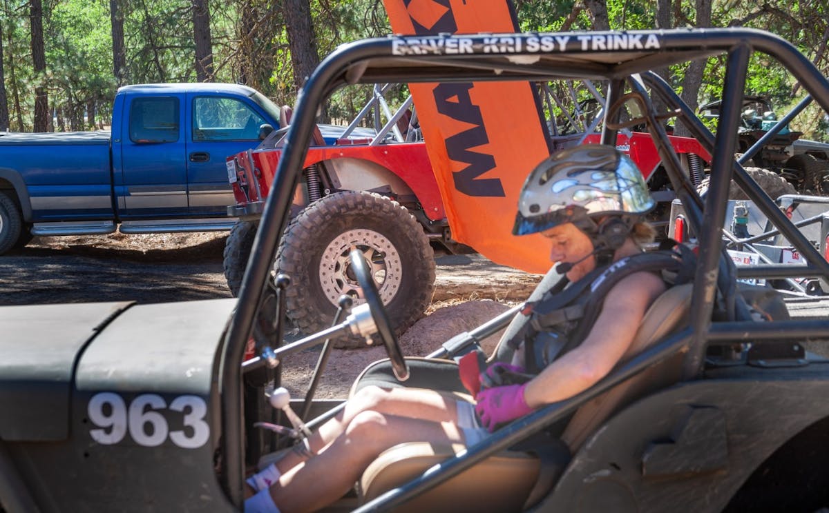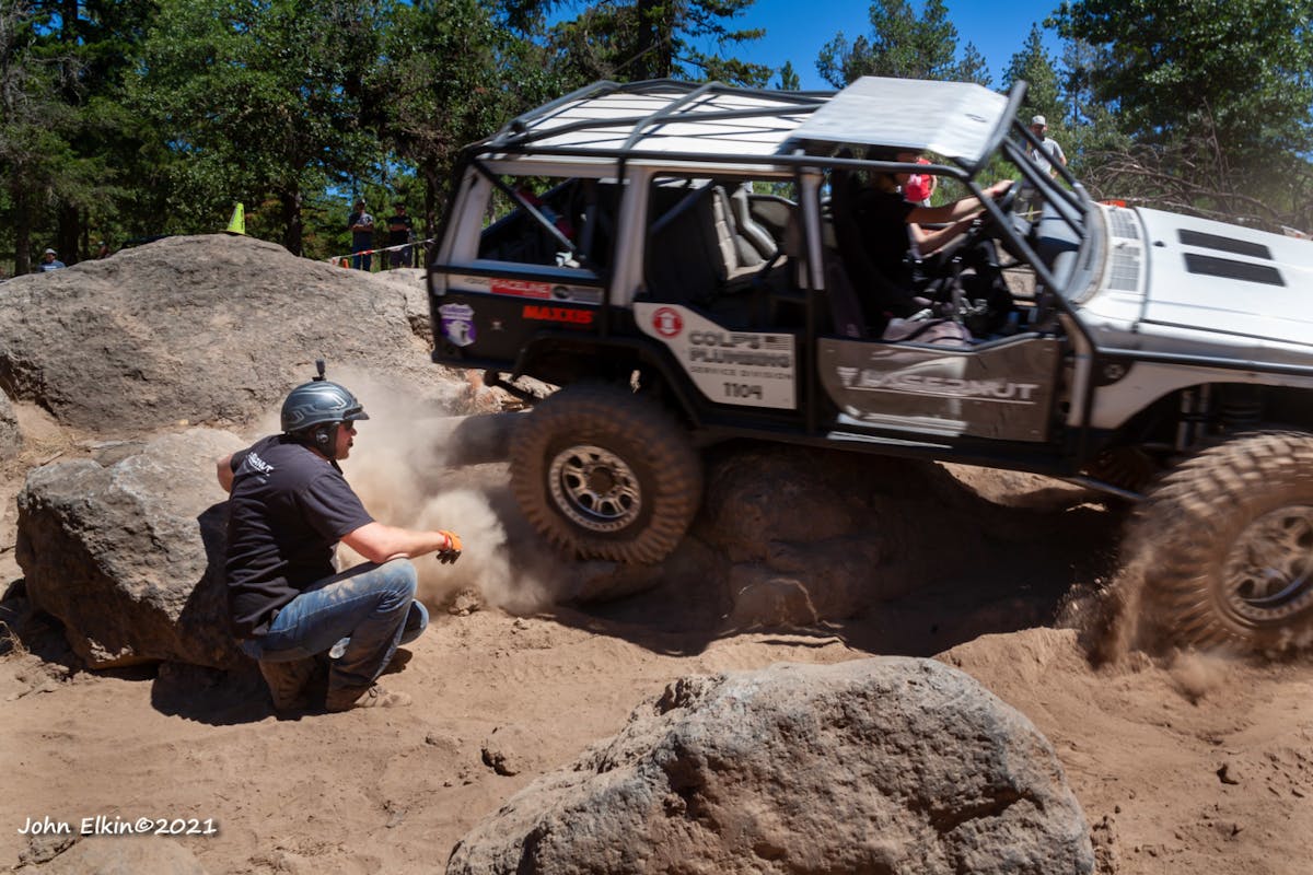 For those not familiar with the sport of rock crawling the teams are amazing to watch. A teams is made up of a driver and a spotter. Spotters direct the driver through gates (orange cones) with precision. Spotters do not ride in the vehicle. A spotter can, however, move rocks, logs, and branches within the course to aid traction.