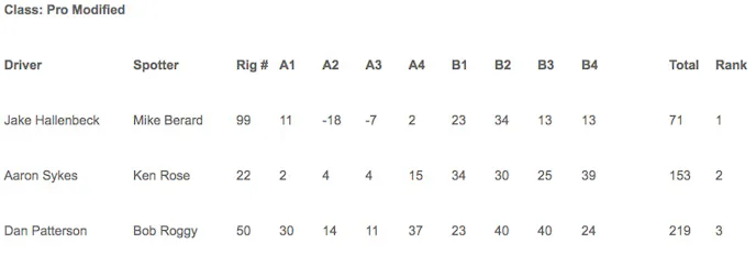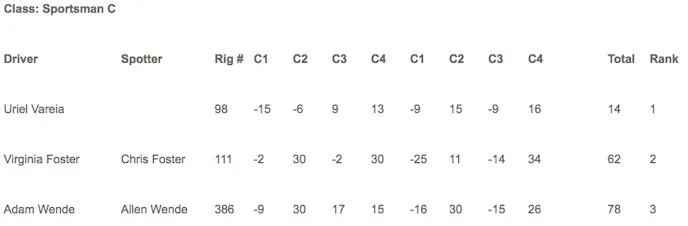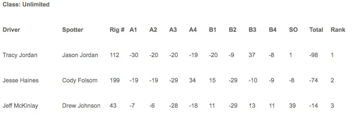 Winners in rock crawling events are often determined by a small number of points. The slightest touch of a cone with one wheel can be the difference between making the podium and going home empty-handed. The tables below show the top three teams after completing the eight courses over the weekend.