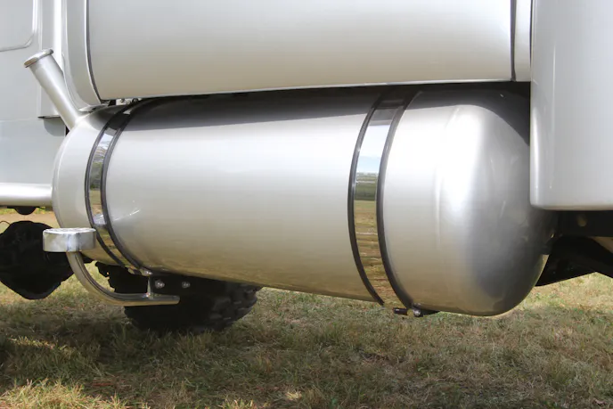 The truck’s exterior further showcases Roger’s creativity. He ditched the factory running boards from the L-110 cab and swapped in a pair of fuel tanks made from 100-pound propane tanks. This combination generates a little over 47 gallons of overall fuel capacity. Up front, he designed and built a steel tube bumper made from 1 1/2-inch-diameter material that curves perfectly with the grille’s body line and is skinned in 1/8-inch sheetmetal. Each custom bedside running board follows the same formula.