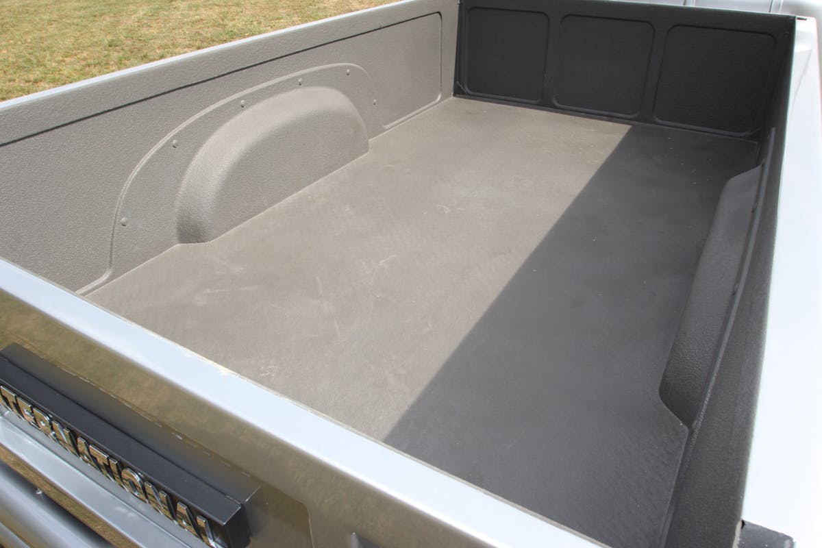 The cargo bed combines parts from two L-110 beds. Roger fabbed crossbars and laid down 14-gauge diamond plate for the floor and coated the bed and tailgate in Rhino Linings. He also built the tailgate, complete with frenched-in taillights and a diamond-plate inner surface.