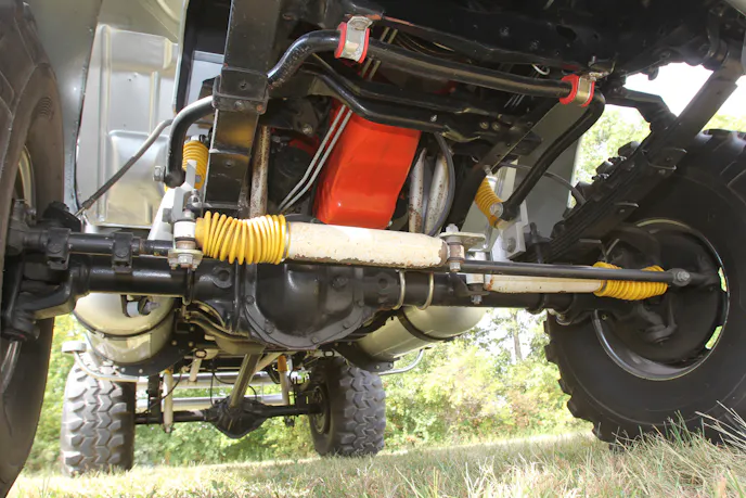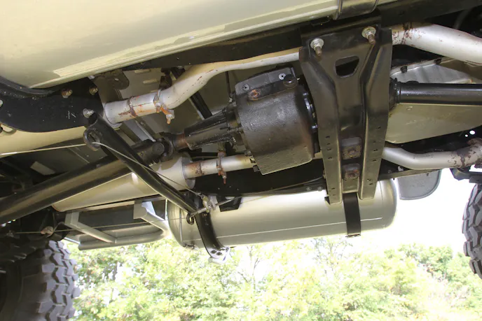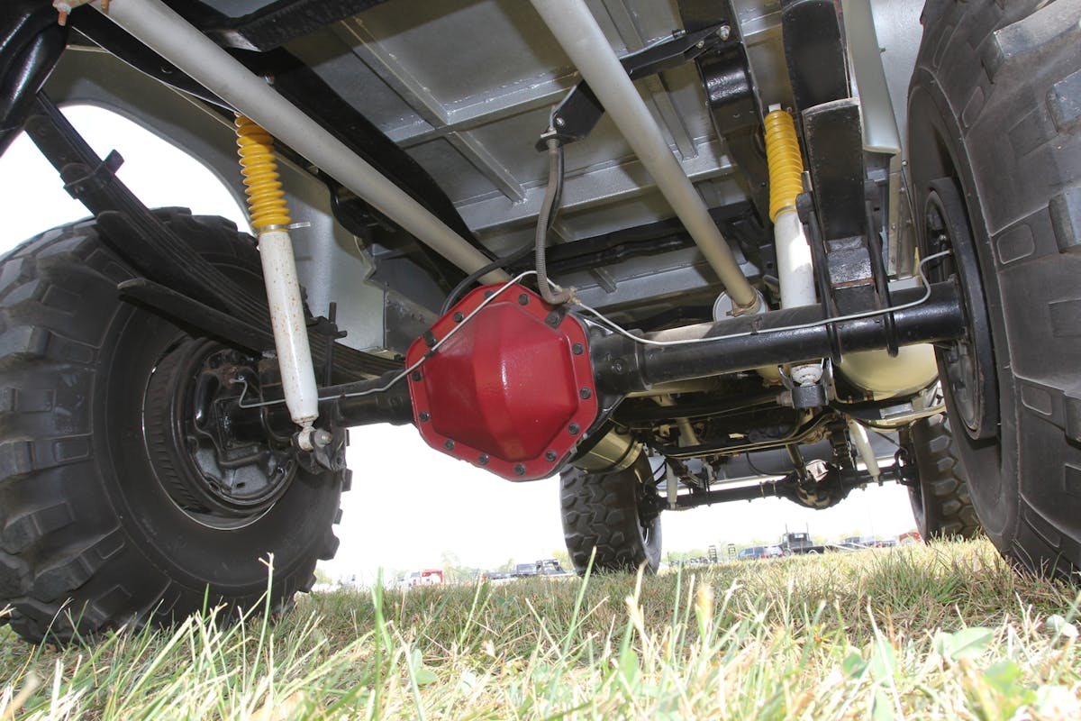 Up front is a tried-and-true Dana 60 axle fitted with Warn manual locking hubs. Out back is a GM 14-bolt. Both have 4.10:1 gears and were rebuilt by Roger. The steering system includes dual stabilizers.