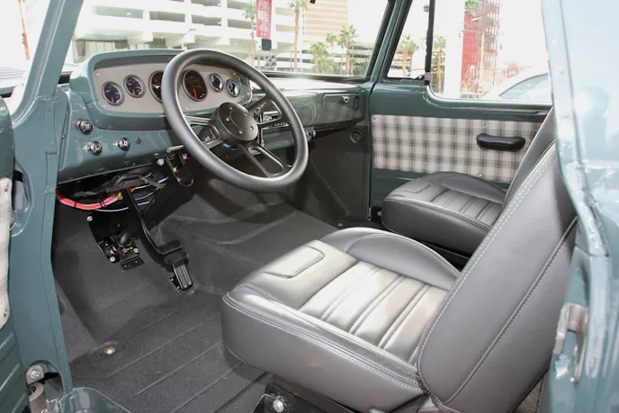 The truck’s interior blends vintage style with modern upgrades. It features TMI front and rear seats, GlowShift gauges in the factory dash, a modified factory steering column, and an aftermarket Peterbilt-application steering wheel. The firewall and bed tub are coated in Raptor Liner, and the cabin got an aftermarket audio system plus custom plaid door inserts and headliners.