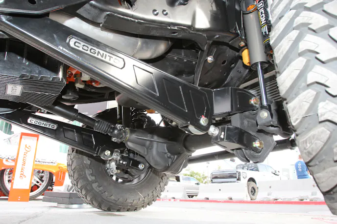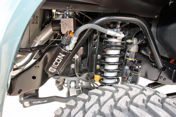 Out back, Carli 1-inch-lift leaf springs team up with Icon 2.5 piggyback shocks. Every 2.5 shock on the truck features the company’s Compression Damping Electronic Valve (CDEV) and Icon Intelligent Control. A Hellwig Products rear sway bar and Cognito adjustable traction bars round out the setup.