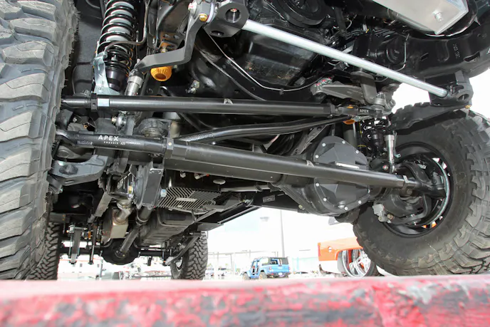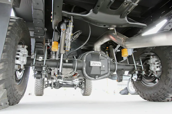 Zach also sourced a pair of axles from Zumbrota Drivetrain. Up front, a Ford Dana 60 packs a Yukon Grizzly Locker, Yukon manual locking hubs, and Apex Chassis billet steering links. Out back, a Ford 10.5 carries another Yukon Grizzly Locker. Both axles spin 4.10:1 gears.