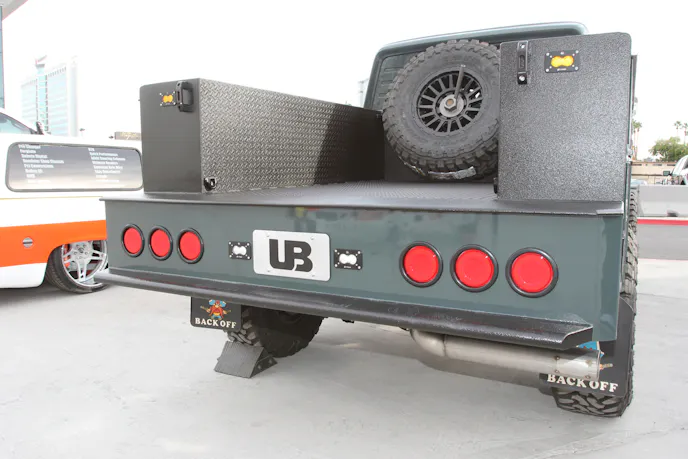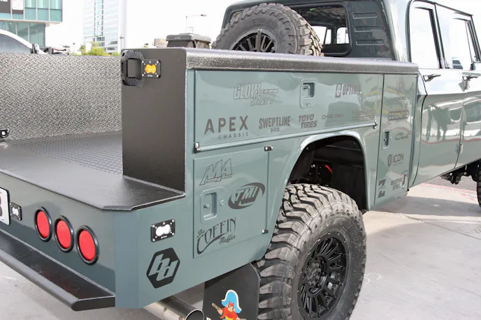“I wasn’t able to find or buy a single piece of sheetmetal for this truck,” Zach says. After sandblasting, he had to build several parts from scratch, including floor pans, cab corners, and rocker panels. The Ford chassis was too long, so he shortened it by 8.5 inches. Once the restored Dodge body was set on the frame, he crafted a custom 12-inch high-clearance rear service-bed bumper and reworked the service bed’s wheel arches. Other exterior upgrades include a custom front bumper, Baja Designs lighting, and Chevy Cypress Gray paint.